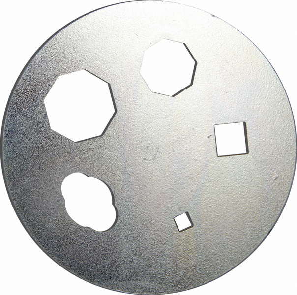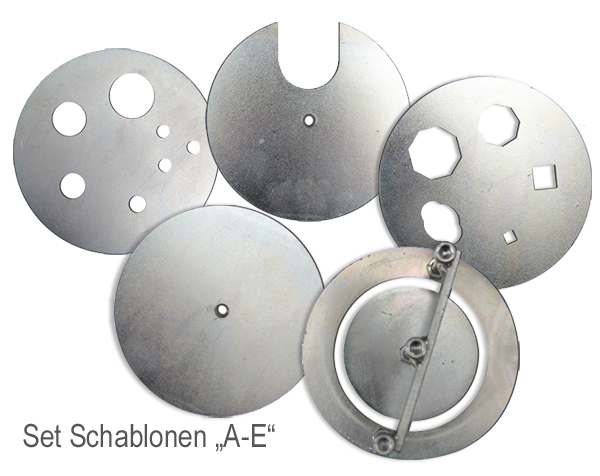 eine Schablone für Henkelformen quadratisch 6 x 6 mm, 12 x 12 mm, 8-eckig mit 20 mm und 24 mm und ellipsenförmig mit 24 mm